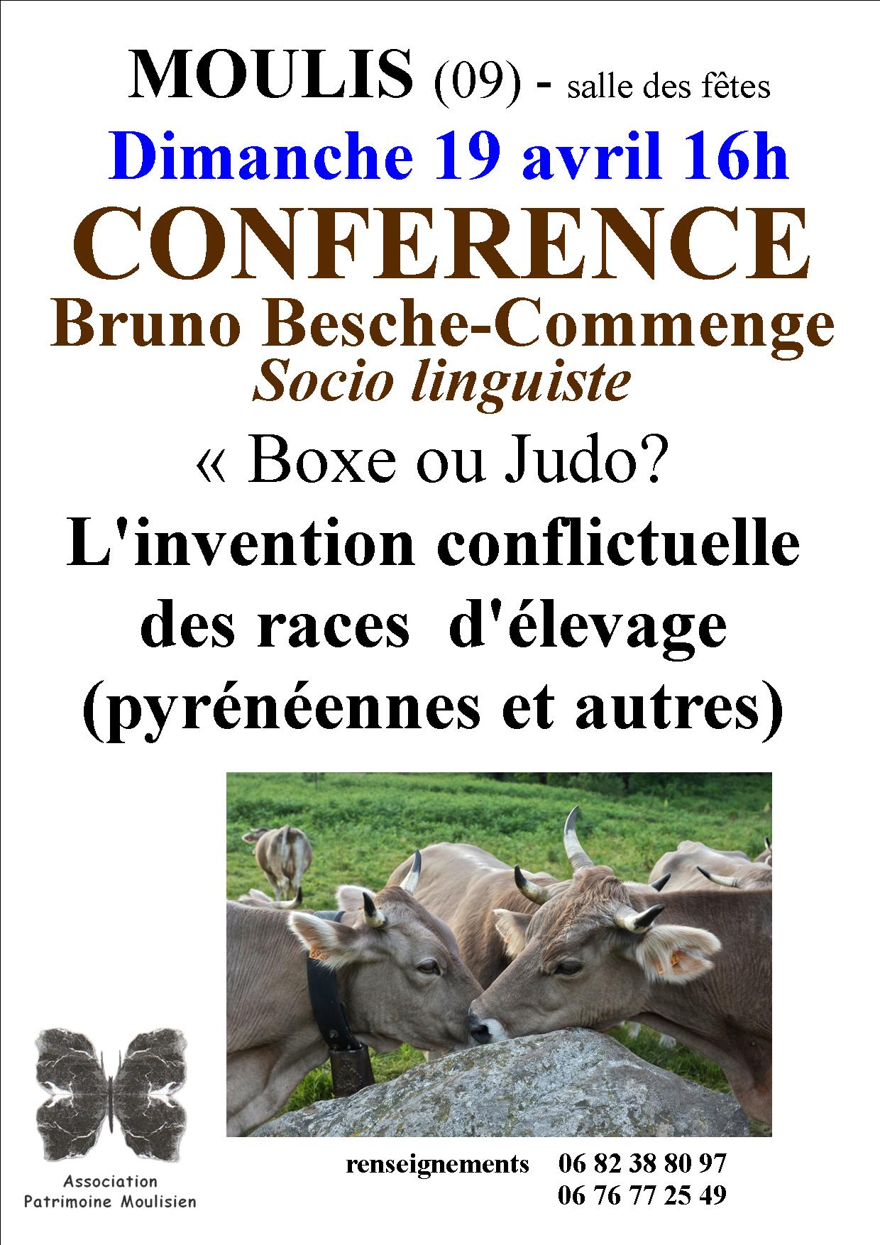 Prochaine animation proposée par notre association : Conférence le dimanche 19 avril à 16 h avec Bruno Besche-Comminges, socio linguiste : "boxe ou judo ? : l'invention conflictuelle des races d'élevage (pyrénéennes et autres) - salle des fêtes Moulis - entrée libre.